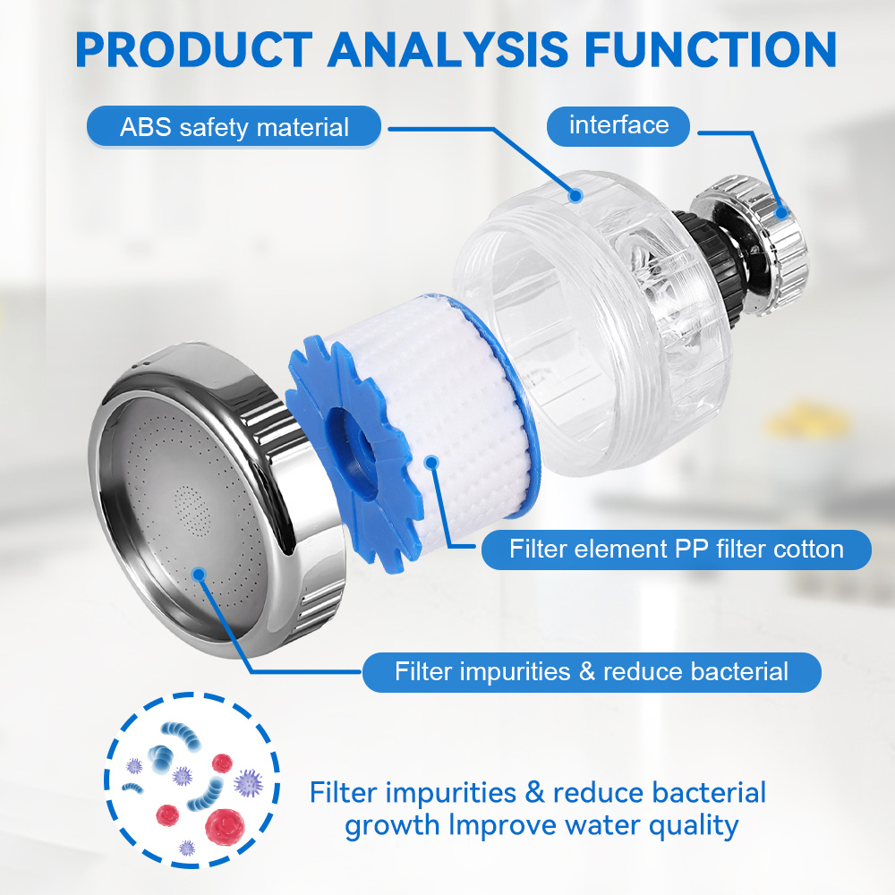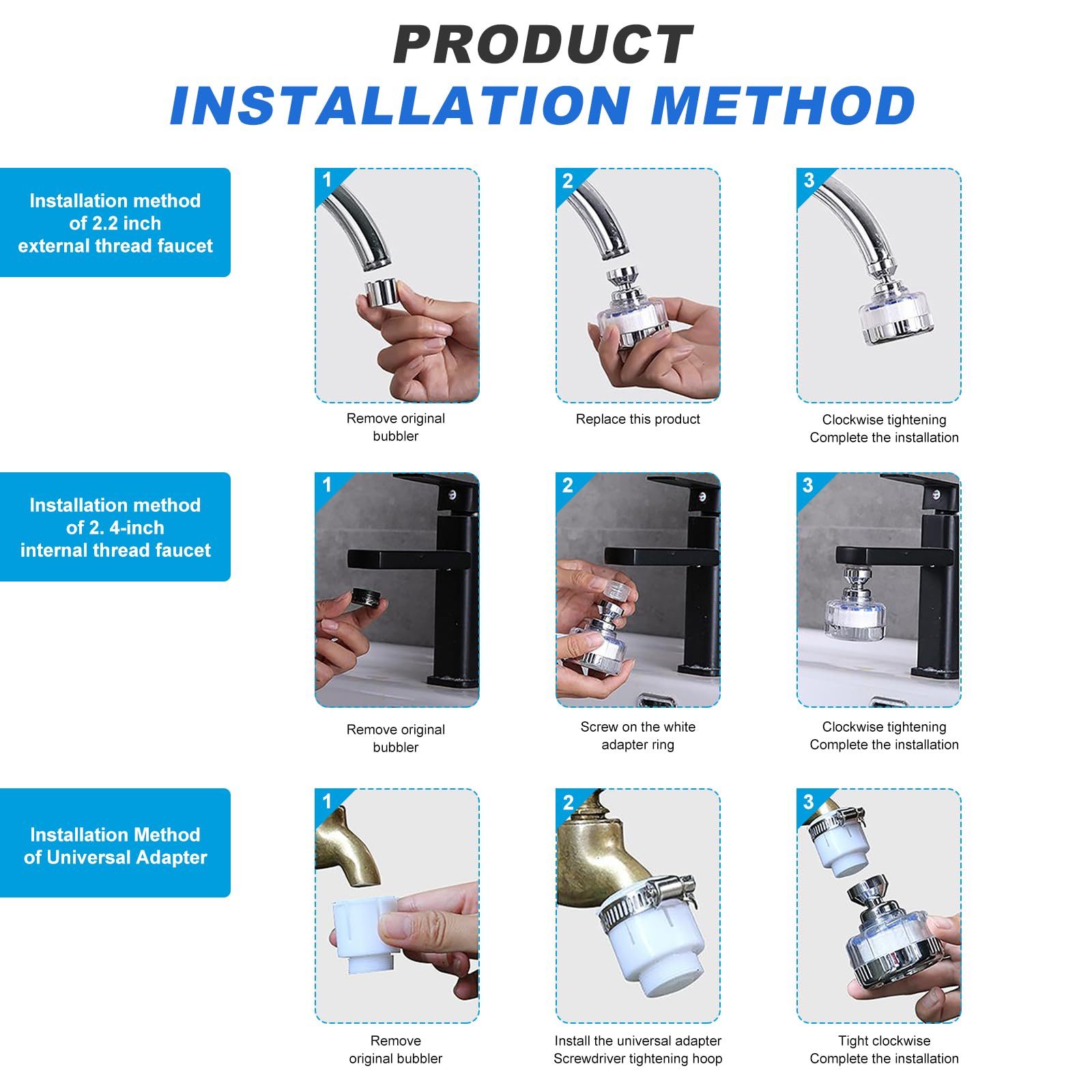【360° ROTATING DESIGN】 : Kitchen faucet water filter can be rotated 360°easy to install,Multi Angle Rotation. Water faucet filter can effectively increase the water pressure, flushes powerfully and prevent splashing, and saves water, make it easier to clean vegetables, plates and other kitchen stuff,and other kitchen stuff, is very practical kitchen faucetfilter.