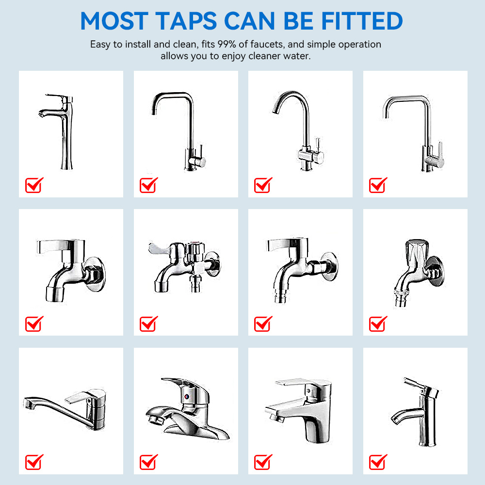 【EASY TO INSTALL & CLEAN】:This item be directly mounted on the faucets with 22mm male thread diameter,or use with the included faucet adapter to mount on the faucets with 23.5-24mm female thread diameter,and tighten it clockwise.when cleaning simply remove the strainer ,equipped with a clasp, water filter and purifier is safe and secure, not easy to fall off, prevents excessive water flow from being washed off.